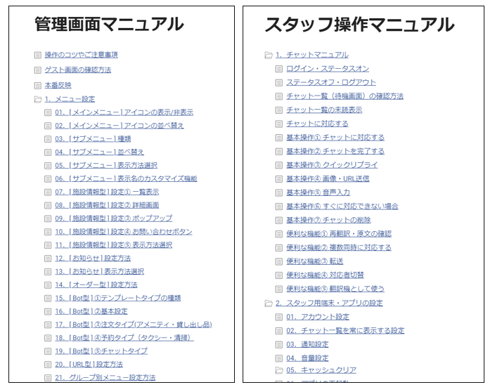 管理画面やチャット画面へのログインの手順やご使用に際しての注意事項を分かりやすく掲載しています。新しく担当になられたスタッフ様でも手順通りに進むだけで簡単にログインが可能です。ログイン後の操作マニュアルもご覧いただけます。項目ごとに内容がまとまっているので、知りたい項目が見つけやすくなっています。